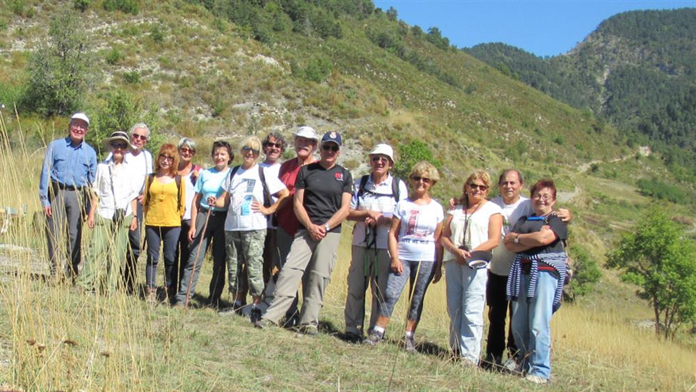 Le démarrage fut dur au départ de Toudon à cause d'un fort pourcentage, heureusement arrivé dans la pinède de Gabergia, ce fut plus raisonnable. Nous traversons quelques ruines à Sebairons, il reste de belles planches dans ce hameau auparavant cultivé. Le passage dans les éboulis avec de belles parois au dessus de nous fut un moment distrayant. Après la baisse des collettes nous montons en direction de la cime par un chemin régulier en sous bois. Chacun à son rythme arrivera à un collet proche de la cime. Nous fêtons l'anniversaire de Jean Claude sur un mamelon proche qui nous offre une vue incomparable sur les montagnes enneigées du Mercantour. Après le picnic, quelques courageux vont à la cime des collettes ( + 70 m ), La descente un peu raide fatigue beaucoup de jambes, mais tout les marcheurs finiront même fatigués, heureux de la sortie.