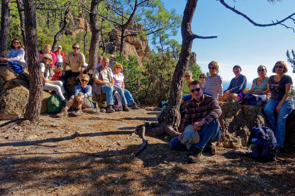 Un peu de fraicheur pour démarrer la balade, mais très vite un beau temps ensoleillé nous a accompagné dans cette partie de l'Estérel. Le début sur chemin goudronné fut vite remplacé par un chemin de terre, puis une côte caillouteuse nous a mené au col du Trayas. Le temps de souffler et nous montons au rocher des Monges ! 300 bons mètres de dénivelé. Il est tôt, mais manger notre casse croûte ne fait pas de doute. Le retour se fait par le col de Théoule et le vallon de l'autel. Arrivé en ville nous devons montrer le pass sanitaire pour traverser la fête du vin ? On arrive au port, les 19 participants retrouvent les voitures.