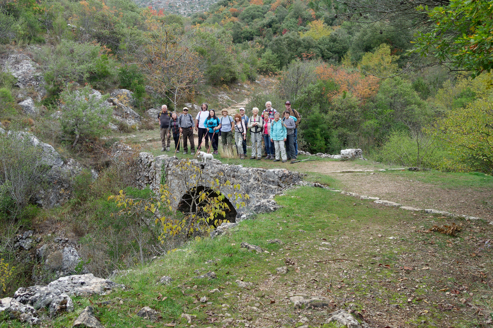 Pour cette sortie inédite, 10 randonneurs curieux sont venus découvrir Peillon. La vue de la vallée, où l'on voit le village perché sur un piton, est impressionnante. Le départ par "lou calada" nous as mis dans l'ambiance, forte montée et forte descente dans un chemin inondé. La suite de la sortie a été plus paisible. Le parcours dans le vallon de Galembert le long d'un torrent parsemé de cascades et launes était ravissant. Nous traversons 2 ponts voutés anciens. Le circuit nous oblige à traverser une zone résidentielle avec de belles villas ( Monégasques pour la plupart ) Un chemin communal préservé entre les villas nous amène le long du ravin de Saint Martin. C'est là que nous faisons la pause " Beaujolais nouveau". L'arrivée sur le village de Peillon est agréable, on y voit Peillon en haut d'une falaise . Nous visitons le village très ancien, avec des passages voutés, des calades en bon état, nous finissons sur la place de l'église, appelée place de la Ghiesa ? Les participants à la sortie ont apprécié la découverte de cet itinéraire dans une partie du département méconnue pour la plupart.